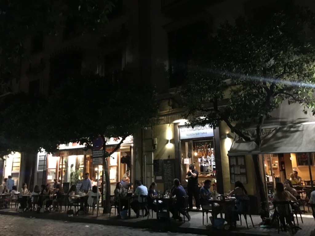 Spaniards love and are accustomed to spending time outside. Throughout the year, you can see people standing outside open-air cafes with their Cruzcampos, deep in conversation. You’ll also see people with bottles of alcohol in the streets and squares. This trend is called “botellón,” and a typical place for it is the Alameda de Hércules, a large square lined with numerous restaurants and bars. However, it has become increasingly difficult to spend the evening this way due to complaints from neighbors. However, young people still gather along the river and in the parks to enjoy the sunny weather and each other’s company.